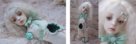 オールビスク、施釉︱翡翠色のグラスアイ、ホワイトモヘア︱size:約20cm︱2025年︱680,000円(税込)
